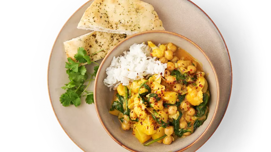 - Skær kartofler og blomkål i mundrette stykker, og tilsæt grøntsagerne til gryden sammen med skyllede kikærter, karrypasta og krydderier.