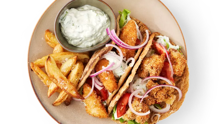 - Lun brødene. Anret hvert brød med grøntsagerne, tzatziki og den sprøde kylling.