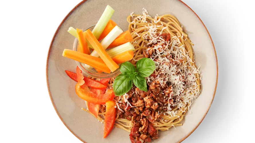 - Kom en god portion linsebolo ovenpå din færdigkogte spaghetti og drys evt. med parmesanost, hvis du har en rest i køleskabet.