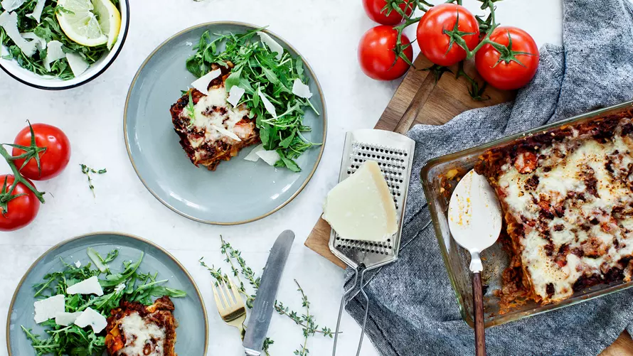 6. Læg kødsauce og lasagneplader, lag på lag, i et ildfast fad og bag ved 200°C i 20 minutter.