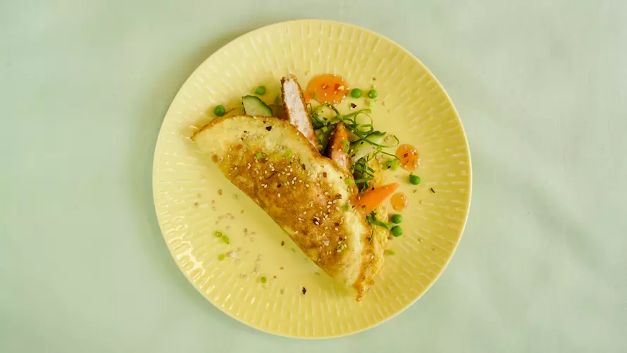 - Bland æggemassen og den overskydende rasp som fileterne blev vendt i, og tilsæt salt, peber og Knorr Aromat. Der bruges ca. 3 æg og 15 g rasp pr. wrap, det vigtigste er blot, at æggemassen ikke bliver for tør/mættet af rasp.